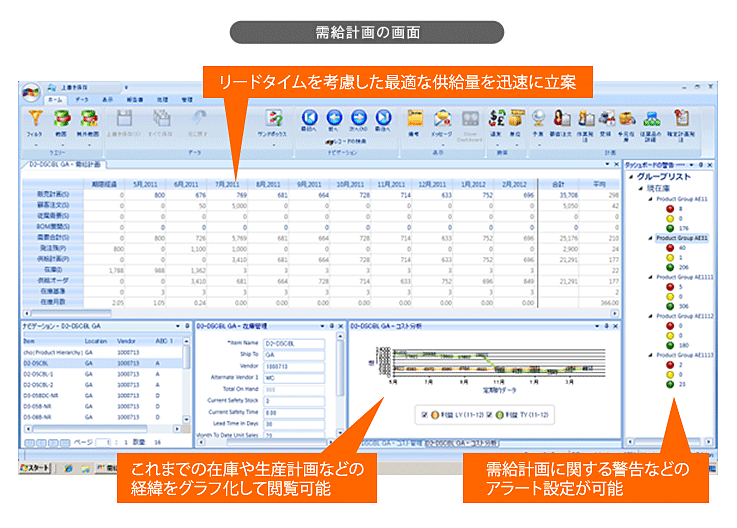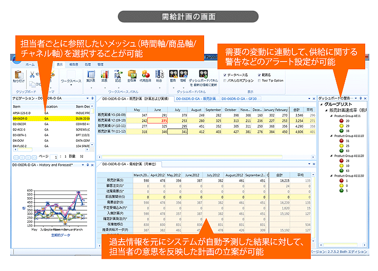 販売計画、生産計画、在庫基準を元に自動作成された計画に対して、意思を反映して需給計画を作成。